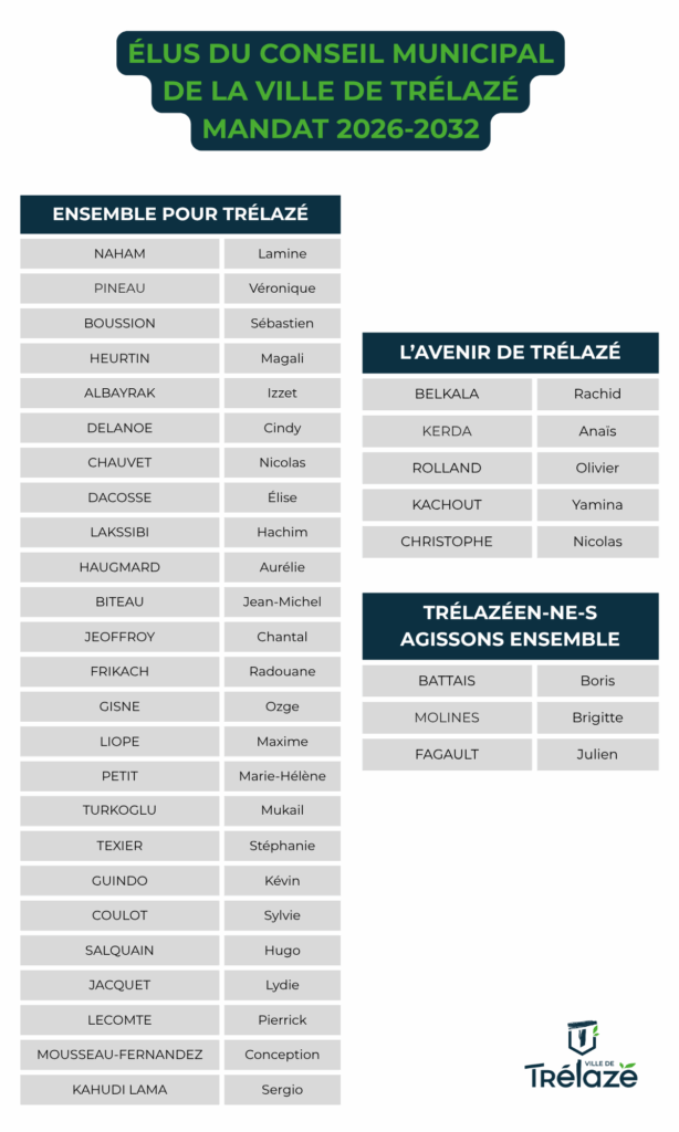 Depuis les élections du 22 mars 2026, le conseil municipal de Trélazé est composé de 24 élus de la liste majoritaire « Ensemble pour Trélazé », 5 élus de la liste minoritaire « L’avenir de Trélazé » et 3 élus de « Trélazéen-n-es, agissons ensemble ».
